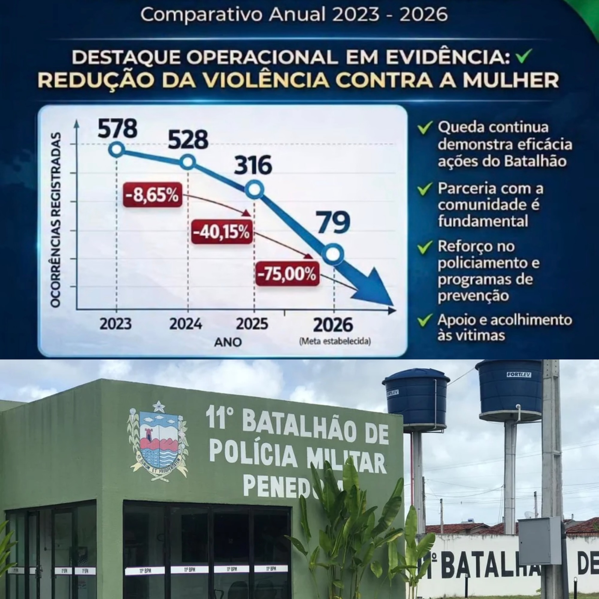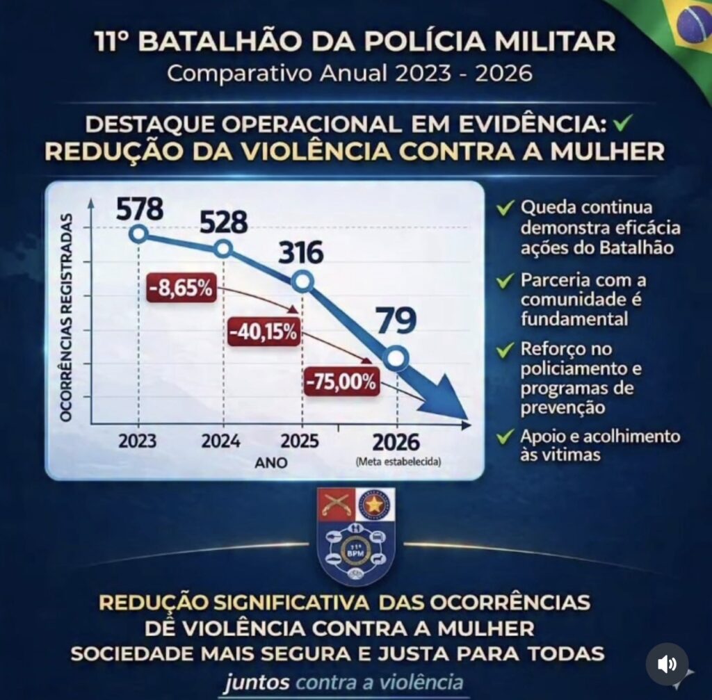 O 11º Batalhão da Polícia Militar tem alcançado resultados significativos no enfrentamento à violência contra a mulher, conforme aponta o comparativo anual entre os anos de 2023 e 2026. Os dados revelam uma redução contínua no número de ocorrências registradas, evidenciando a eficácia das ações implementadas pela corporação.