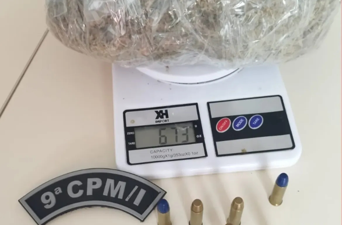 Ao chegar ao local, a guarnição notou movimentação suspeita no interior do imóvel e prontamente agiu para conter qualquer tentativa de fuga. Após abordagem do indivíduo de 39 anos, as buscas foram iniciadas e resultaram na descoberta de aproximadamente 670 gramas de substância análoga à maconha em uma bolsa no quintal. Além disso, seis munições calibre .38 foram encontradas enroladas em um pano, próximo à cabeceira da cama do suspeito.