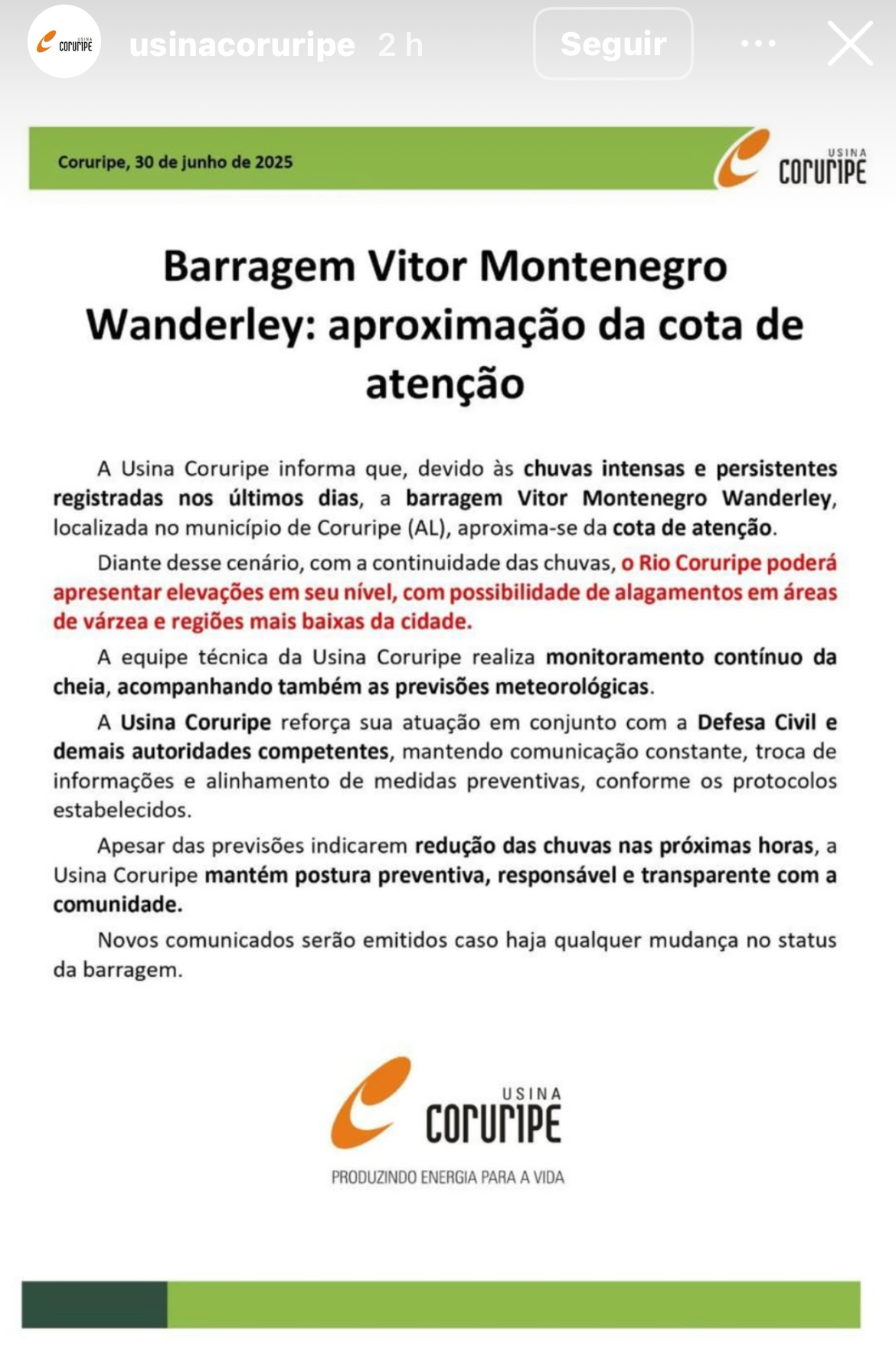 De acordo com a Usina, o volume elevado de água acumulado devido às chuvas aumenta o risco de elevação do nível do Rio Coruripe, o que pode ocasionar alagamentos em áreas de várzea e regiões mais baixas da cidade.