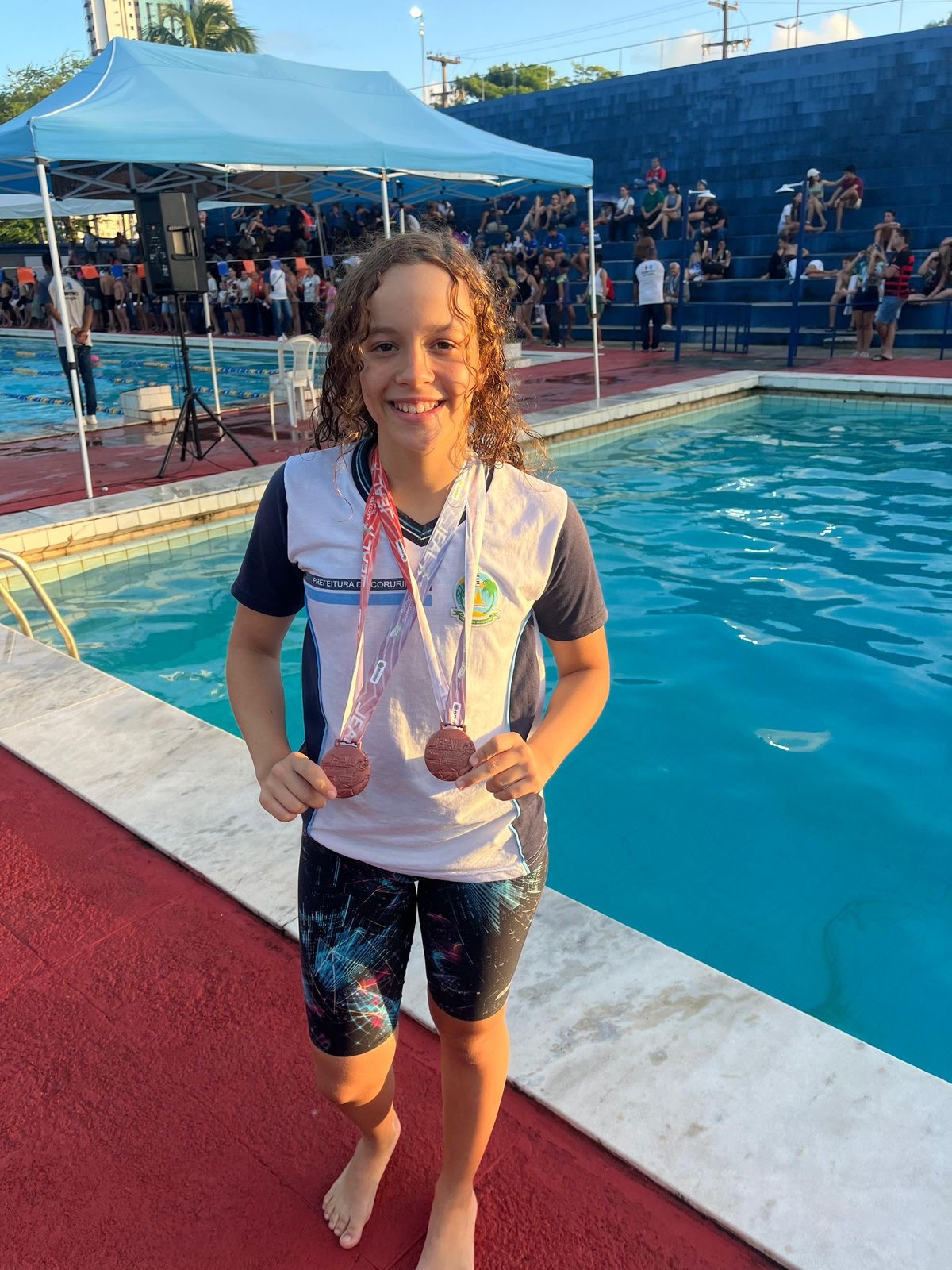 ✨ Maria Gabriella, aluna do 7º ano da Escola Cláudio Daniel, fez história em sua estreia como nadadora profissional, conquistando duas medalhas de bronze nos Jogos Escolares de Alagoas (JEAL), no último dia 21, em Maceió.