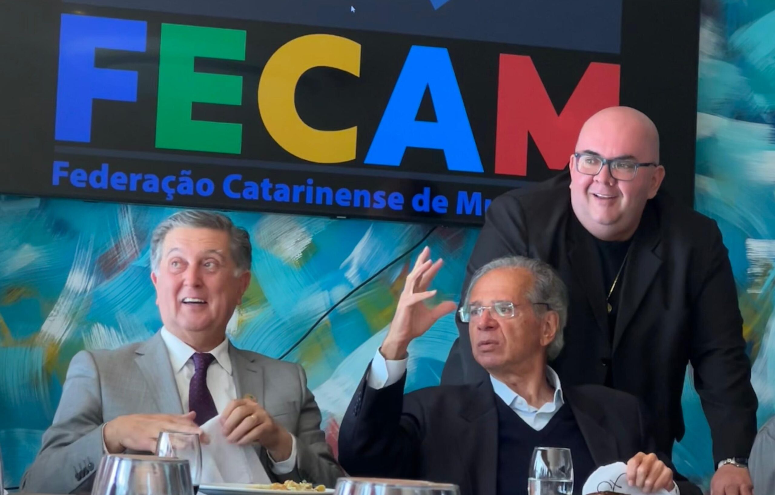 Uma imagem registrada nesta semana mostra Adriano Gatto em um momento especial ao lado do ex-ministro da Economia, Paulo Guedes, e do prefeito de Florianópolis, Topázio Neto, durante um encontro promovido na Federação Catarinense de Municípios (FECAM-SC).