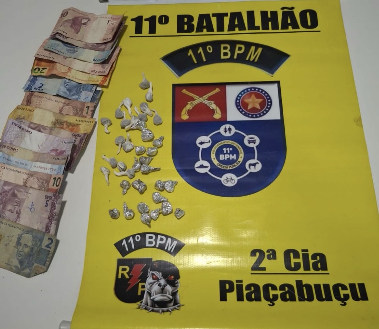 Já com o menor de iniciais F.L., foram encontradas 14 bombinhas de substância análoga à maconha, além de uma quantia em dinheiro trocado. Em seguida, os militares recolheram o pacote dispensado anteriormente, sendo constatado que em seu interior havia 18 bombinhas da mesma substância, embaladas em papel alumínio.